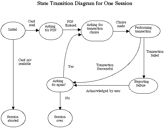 A state diagram is an analysis tool that can be used when a system (or component of a system) passes through a series of discrete states during operation. Trivially, the ATM itself goes back and forth between two states - RUNNING and STOPPED. More interesting, though, is the series of states an individual Session goes through as it gets the customer's PIN and repeatedly gets transaction choices and performs them. A state diagram for a Session is given below. It would also be possible (and perhaps desirable) to construct similar diagrams for transactions. (Is an "exercise left for the student" lurking here?)